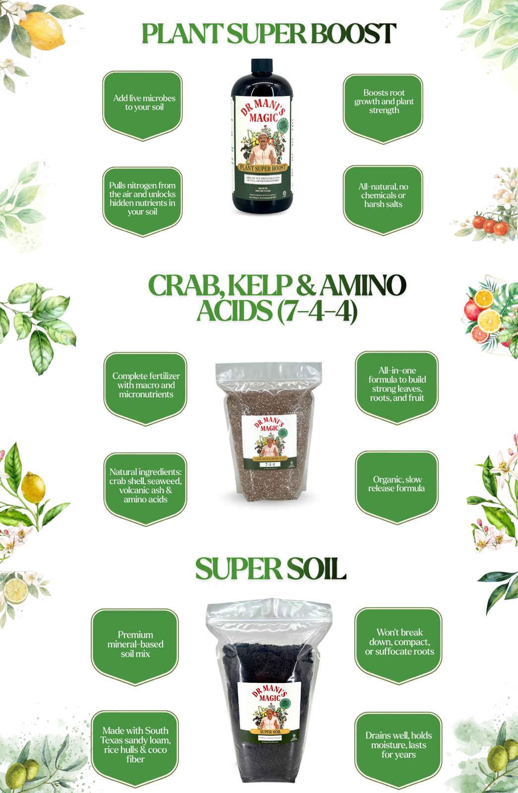 That’s why I created Plant Super Boost, Crab, Kelp & Amino Acids (7-4-4), and Super Soil.